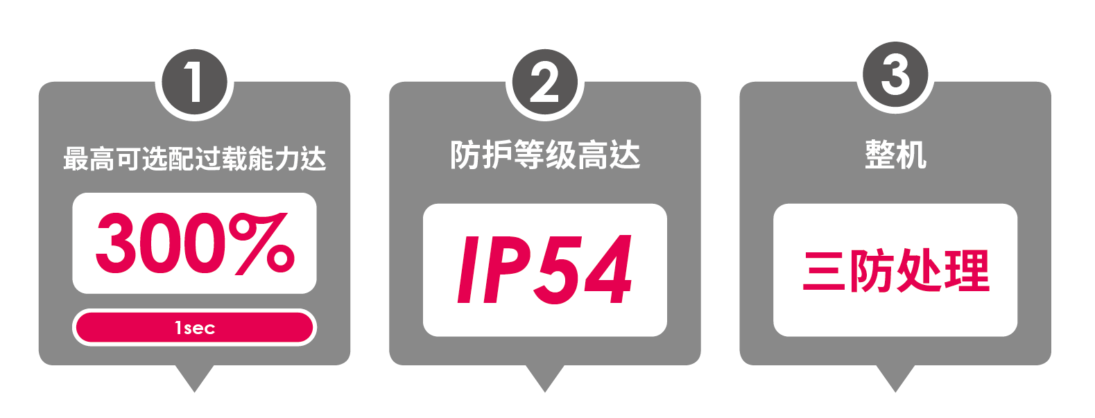 具備過(guò)載能力,125% /600secs、150%/30secs、200%/10secs,并可選配擴(kuò)展的過(guò)載功能。