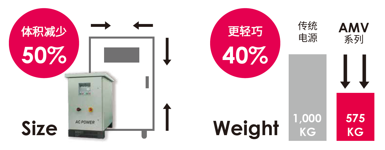 AMV 系列中頻電源,具備業(yè)界領(lǐng)先之體積及重量,比普遍市面上的電源,擁有更高的功率密度,體積相比最高可差至50%,重量更可差達(dá)40%,讓在產(chǎn)品安裝及移動(dòng)上,更具彈性及方便性