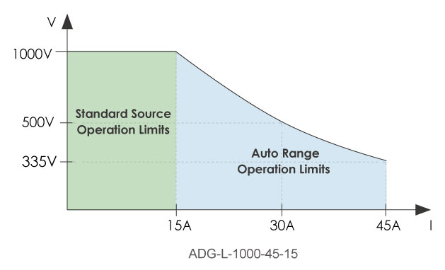 相較于一般的直流電源,寬量程 (Auto Range) 的直流電源具備更寬廣的電壓和電流操作范圍,如圖所示,一般的直流電源在所有的電壓段只能提供相同的最大電流,而寬量程的直流電源則能在較低壓輸出時,提供較高的最大電流。 ADG-L 系列中的多個機型已具備寬量程之功能,方便使用者能用一臺直流電源,滿足高壓低電流及低壓高電流的應用,大幅節省成本及空間。
