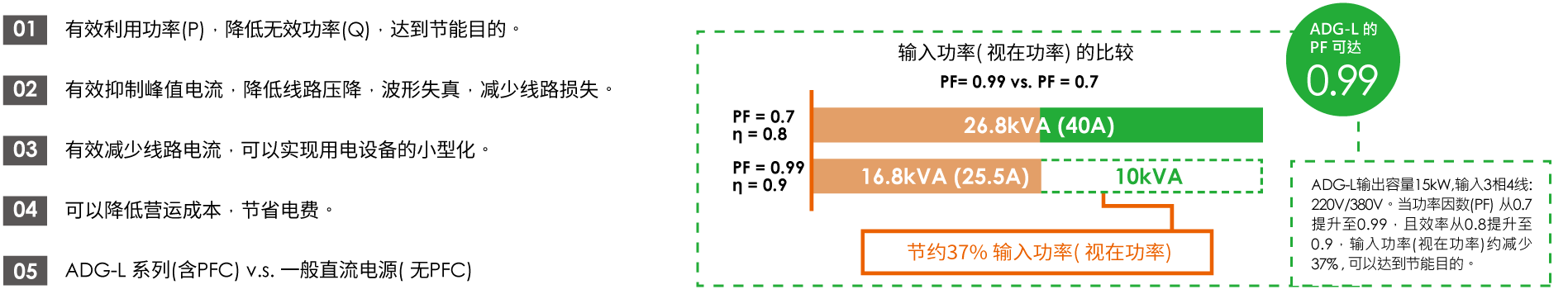 ADG-L 系列內建PFC主動功率因數校正的輸入功因可高達0.99,業界領先,將對電網干擾降到最小。