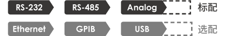 標配 RS-232、RS-485、Ethernet、USB、Analog通訊接口,方便遠端監控及編程,亦可選配GPIB,以滿足工業 4.0 自動化測試應用的需求。